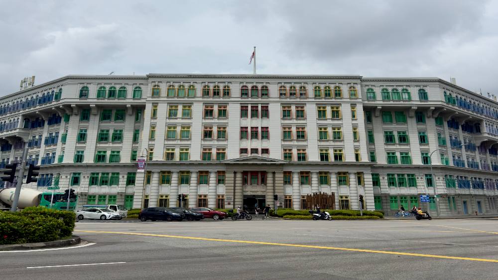 The façade facing Hill Street and River Valley Road features striking Doric pilasters (rectangular columns) that rise across two storeys, while a triangular pediment (upper part of the front of a classical building) crowns the original main entrance. Adding to its architectural charm are intricately designed corbels (structural pieces of stone, wood or metal jutting from a wall) that support the top floor and cantilevered balconies, which extend elegantly around the structure.